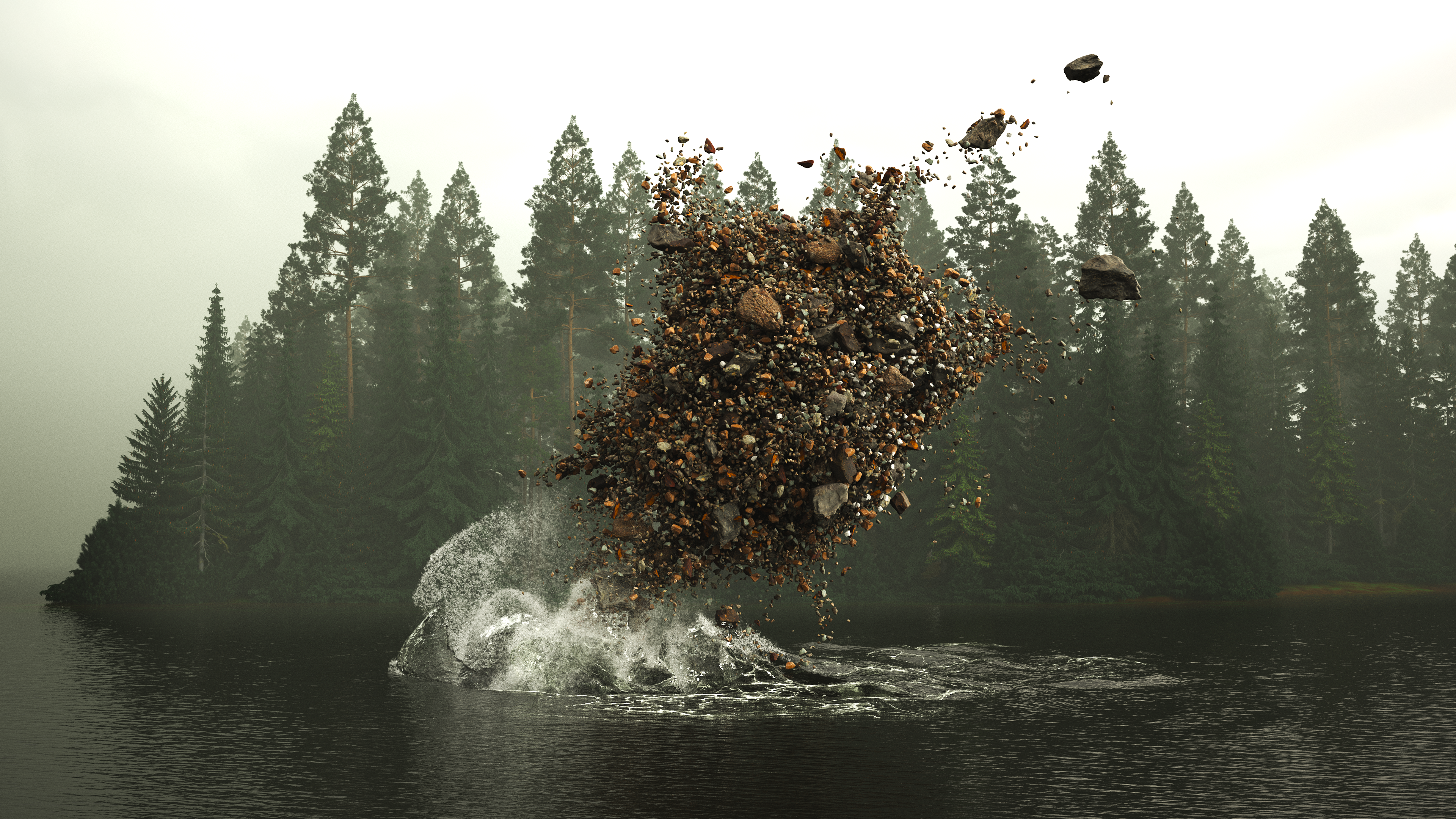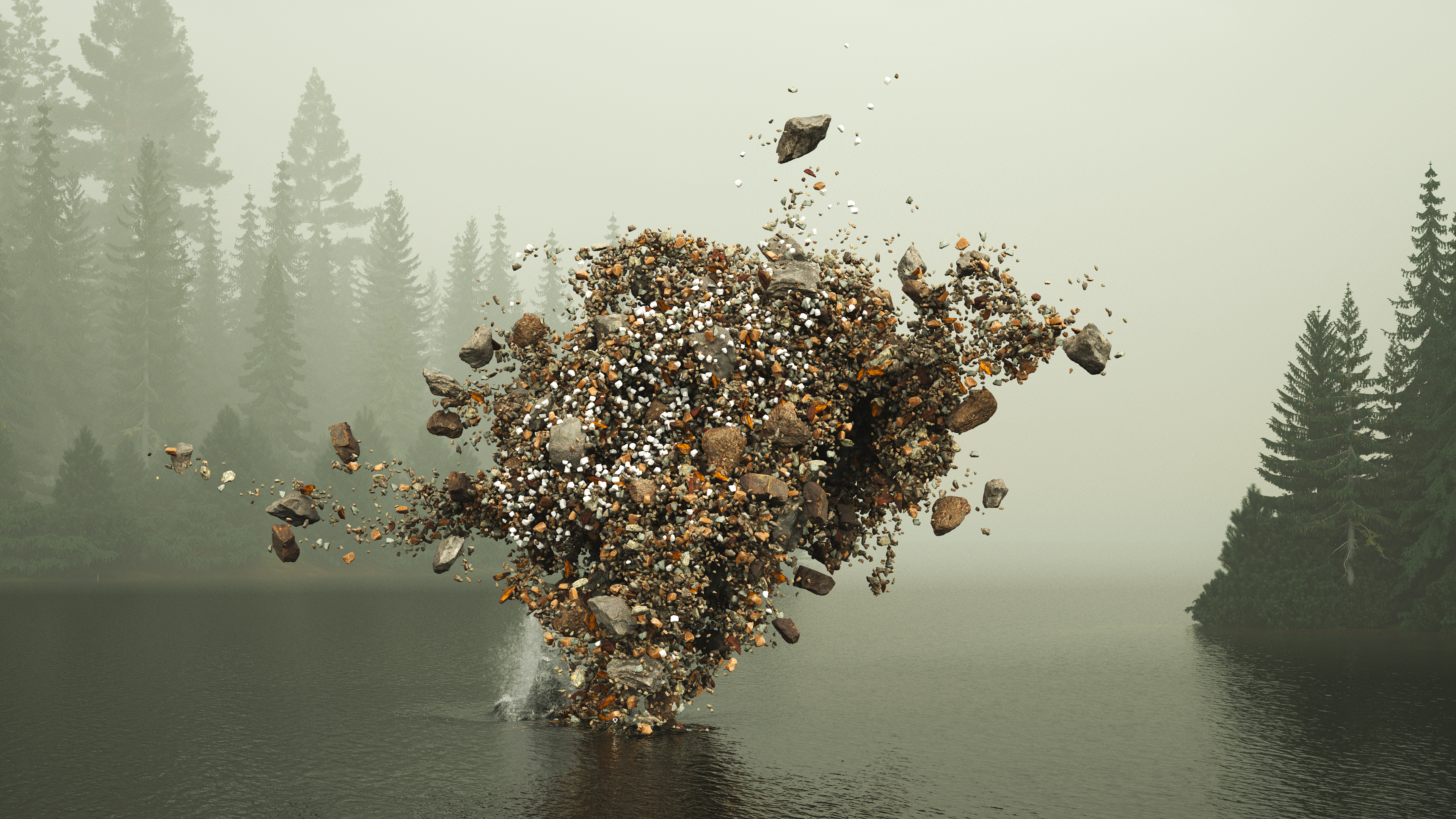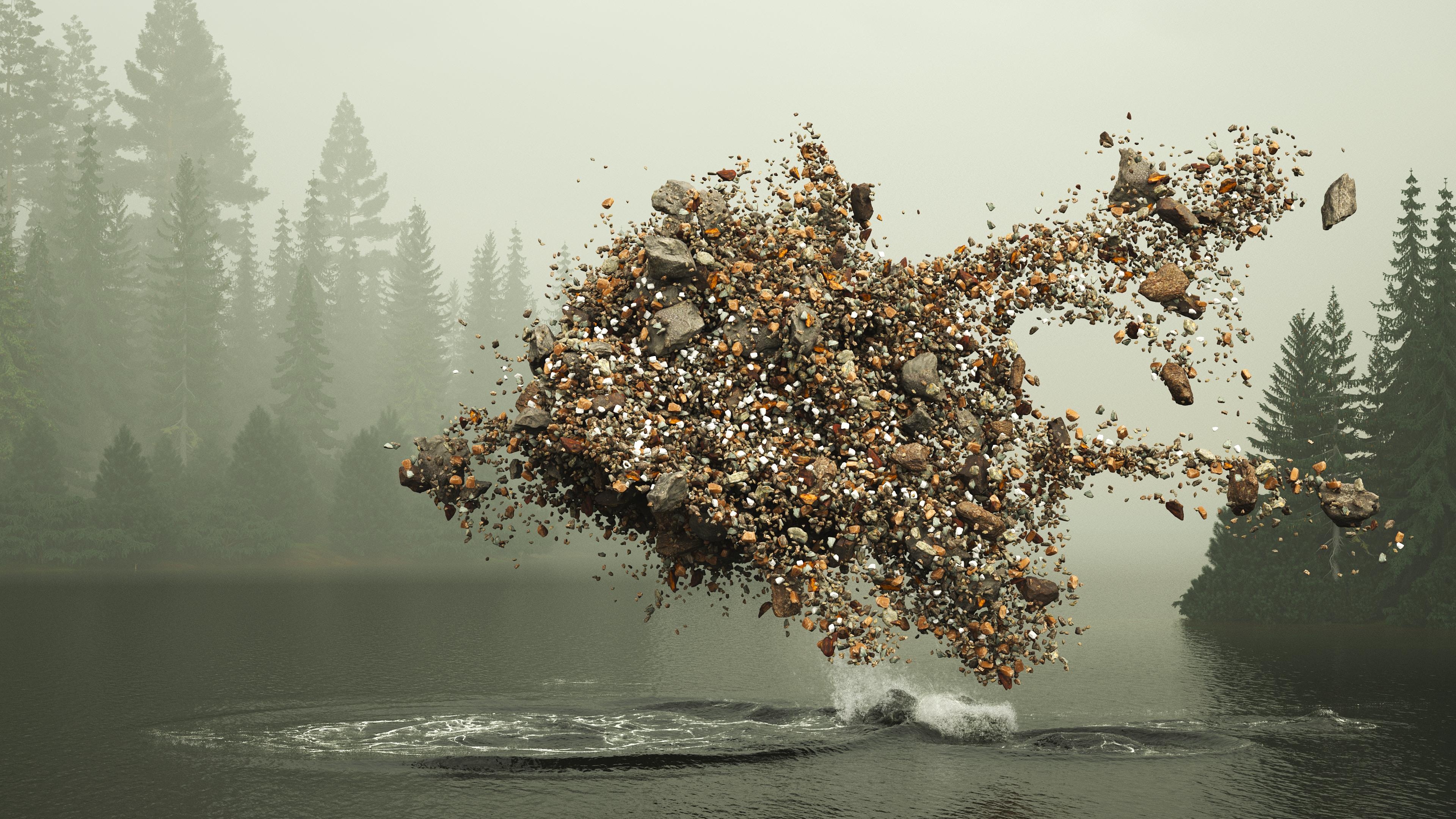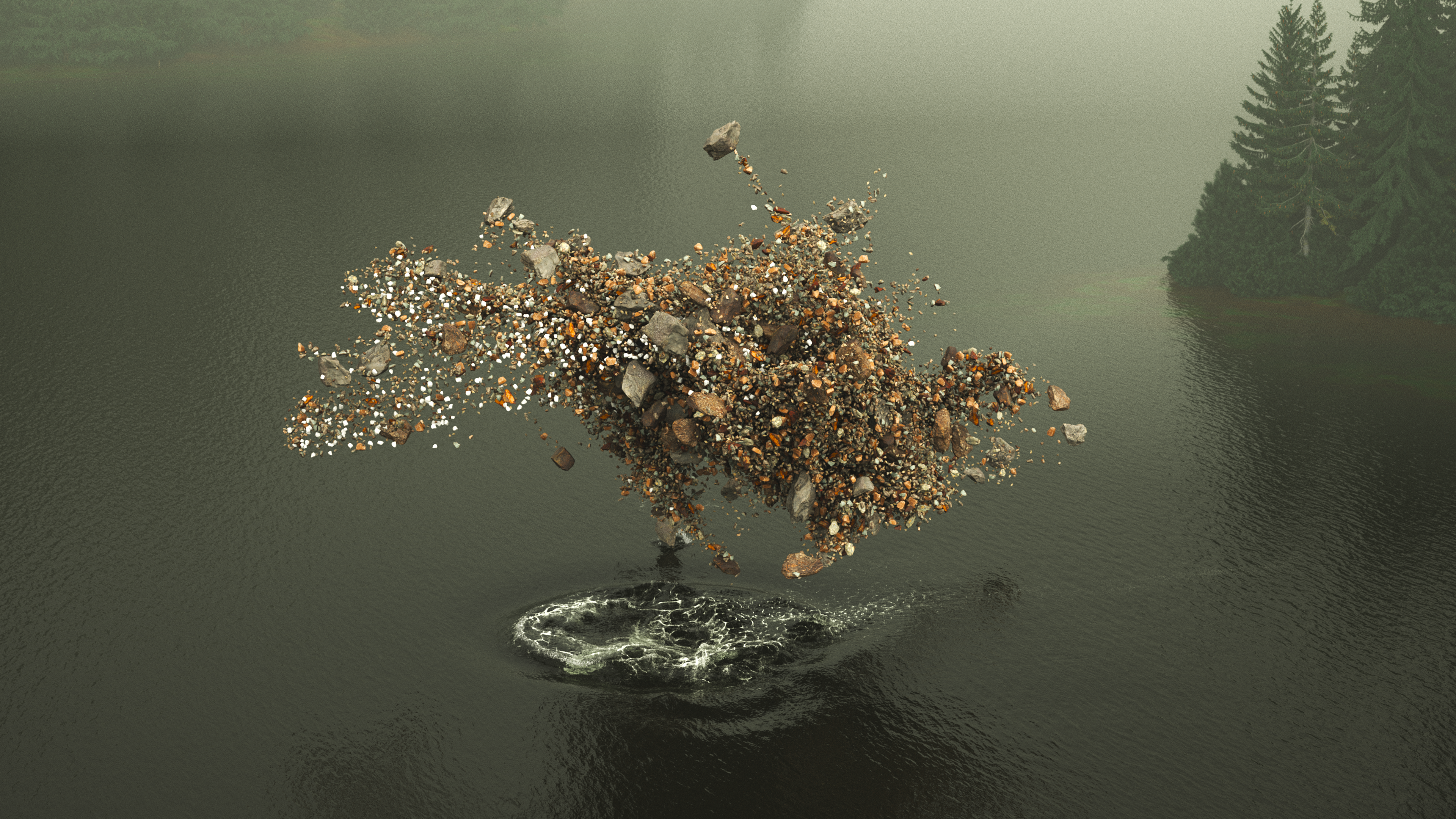 Stone anomaly in the middle of foggy lake creating a serene yet mysterious presence